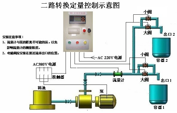 控制儀輸入為4-20mA或脈沖信號,帶外接啟動、停止、清零,兩個繼電器輸出。繼電器到電磁閥需加一個中間繼電器,如果電磁閥是24V供電,需增加一個24V開關電源。 注:指示燈、按鈕、中間繼電器、空氣開關、交流接觸器(可省)、定量控制儀(液晶顯示)、控制箱、組成一個控制系統,控制現場(24VDC)電磁閥啟動或停止,另要加一個總電源開關、流量計,電磁閥,需要按照現場要求來做。(配件可以用戶自己配)